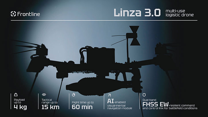 Frontline Robotics states that the Linza 3.0 airframe was engineered specifically for military applications rather than adapted from commercial quadcopter designs. The company prioritized resilient control and video transmission systems to meet operational requirements. Beyond strike missions, the platform is configured for logistics and mine-laying operations, signal relay and reconnaissance, and drone recovery and evacuation.
