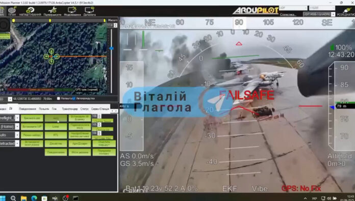 A screenshot from the drone’s view (FPV) during the attack on the Russian Olenya air base shows a line of Tu-95 “Bear” bombers, some already burned by previous drone attacks.